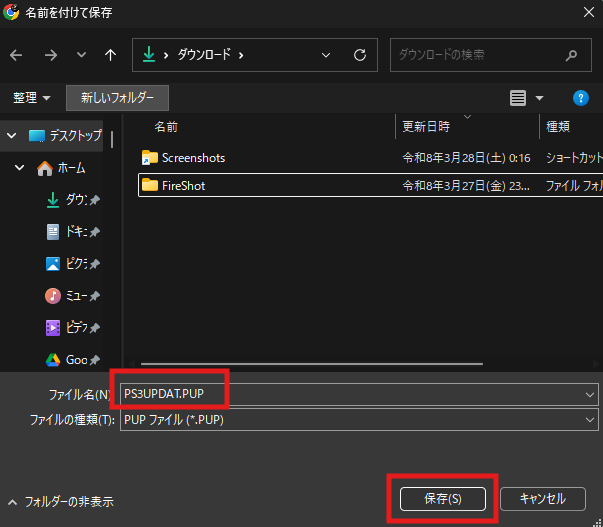 「パソコンを使ってアップデートする」の項目を開き、「PS3アップデートをダウンロードする」のボタンを右クリックして、名前を付けてリンク先を保存を選択してください。