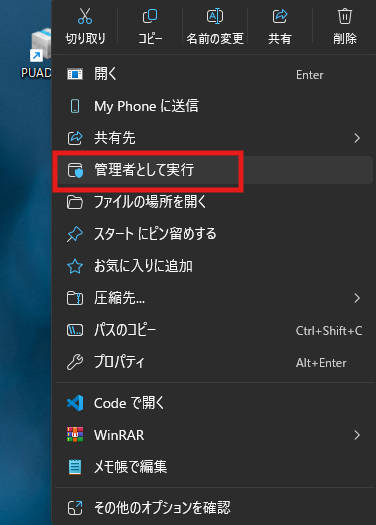 デスクトップに作成されたPUAD GUIのショートカットを右クリックし、必ず管理者として実行を選択して起動します。