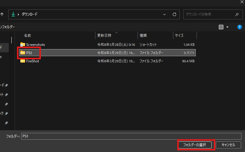 指定したフォルダ(先程作ったPS3のフォルダ)を開きます。