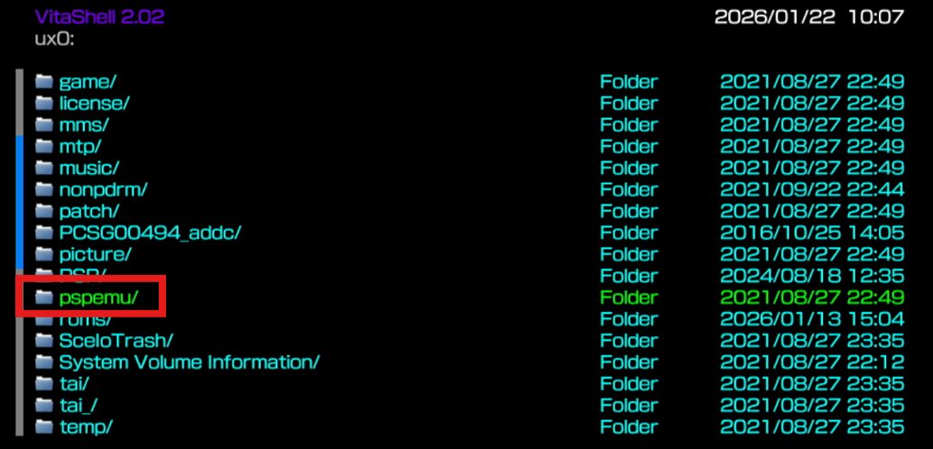 - 改造済みVitaで「VitaShell」を起動し、USB(またはFTP)でPCと接続します。