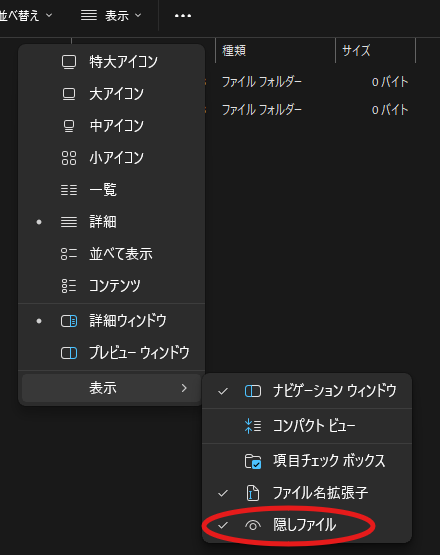 これはVitaのデータがシステムファイルとして保護されているためです。解決するには、PCのエクスプローラー上部メニューから表示設定を開き、隠しファイルを表示する設定に変更します。