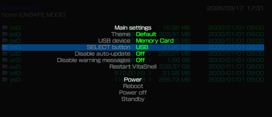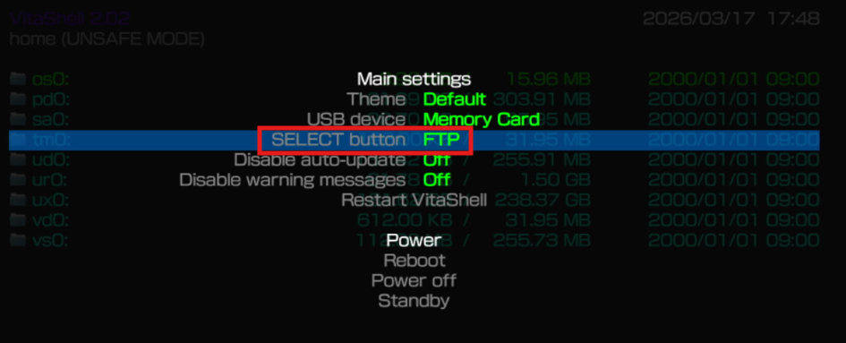 VitaShellを起動した状態でスタートボタンを押してメインメニューを開きSELECT buttonの項目から自身の環境に合わせたモードを設定してください。