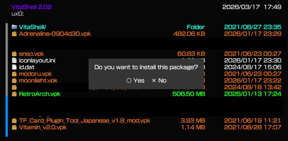 転送後、PCとの接続を解除し、VitaShell上でVPKファイルを選択してインストールを実行すればアプリが追加されます。