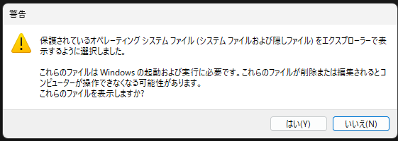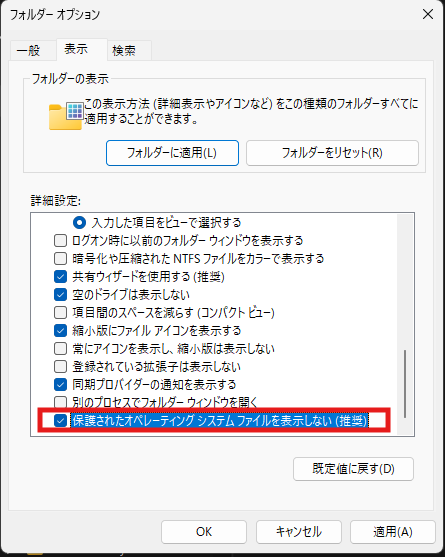 さらに、フォルダーオプションから保護されたオペレーティングシステムファイルを表示しないのチェックを外してください。