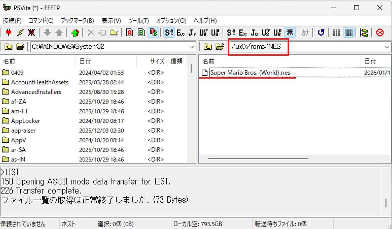 無事に吸い出せた.gbや.sfcファイルを、PC経由でVitaへ転送します。(VitaShellを使ってFTPやUSB接続で転送してください。フォルダは ux0:roms など分かりやすい場所へ置いてください)