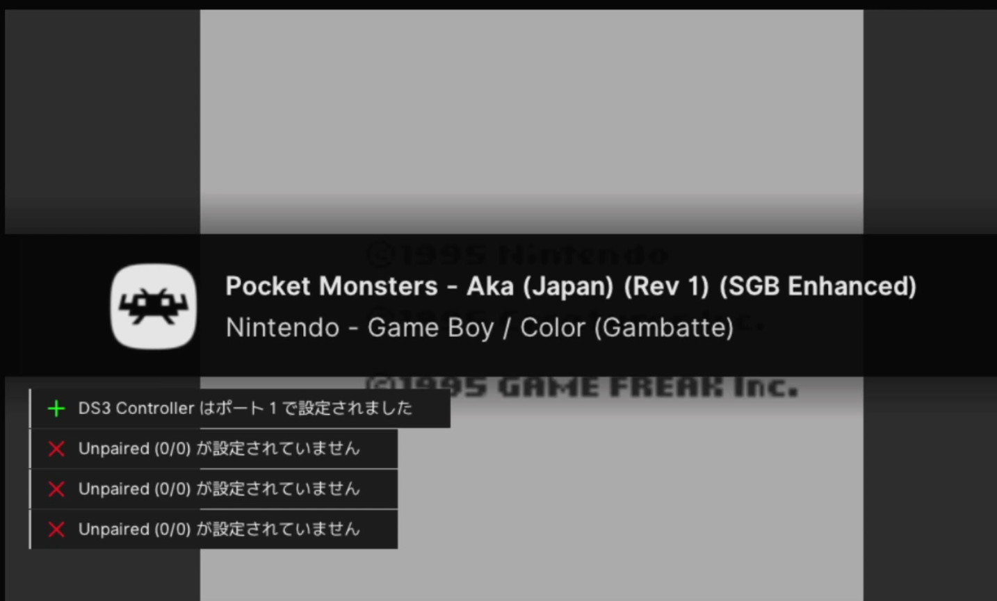 苦労の末、ゲームボーイの『ポケットモンスター 赤』の起動を確認。
