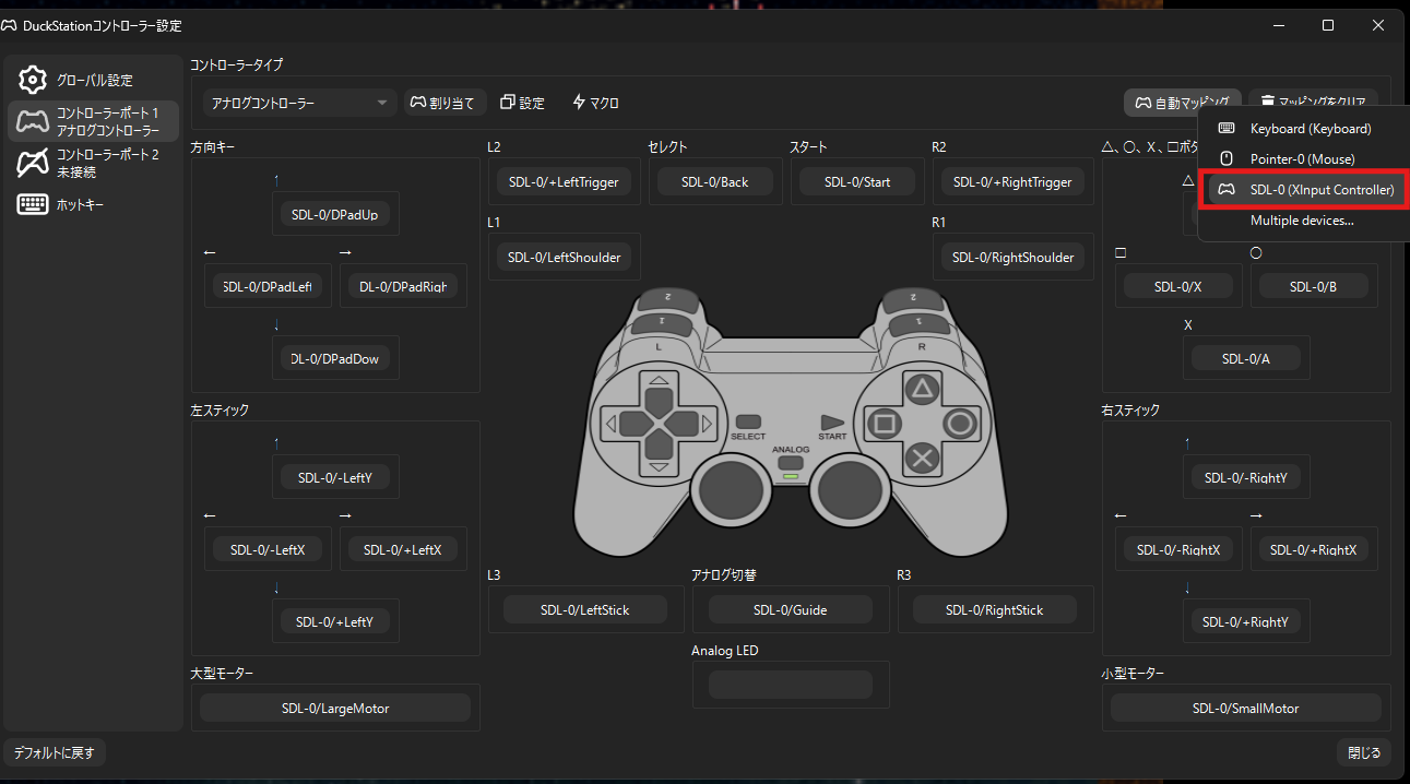 - PC側でDuckStationの「設定」→「コントローラー」を開く。