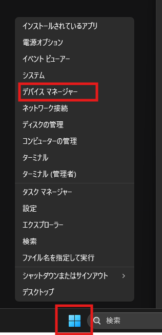 ちなみ、確認方法はWindowsスタートを右クリックしてデバイスマネージャーを開けます。